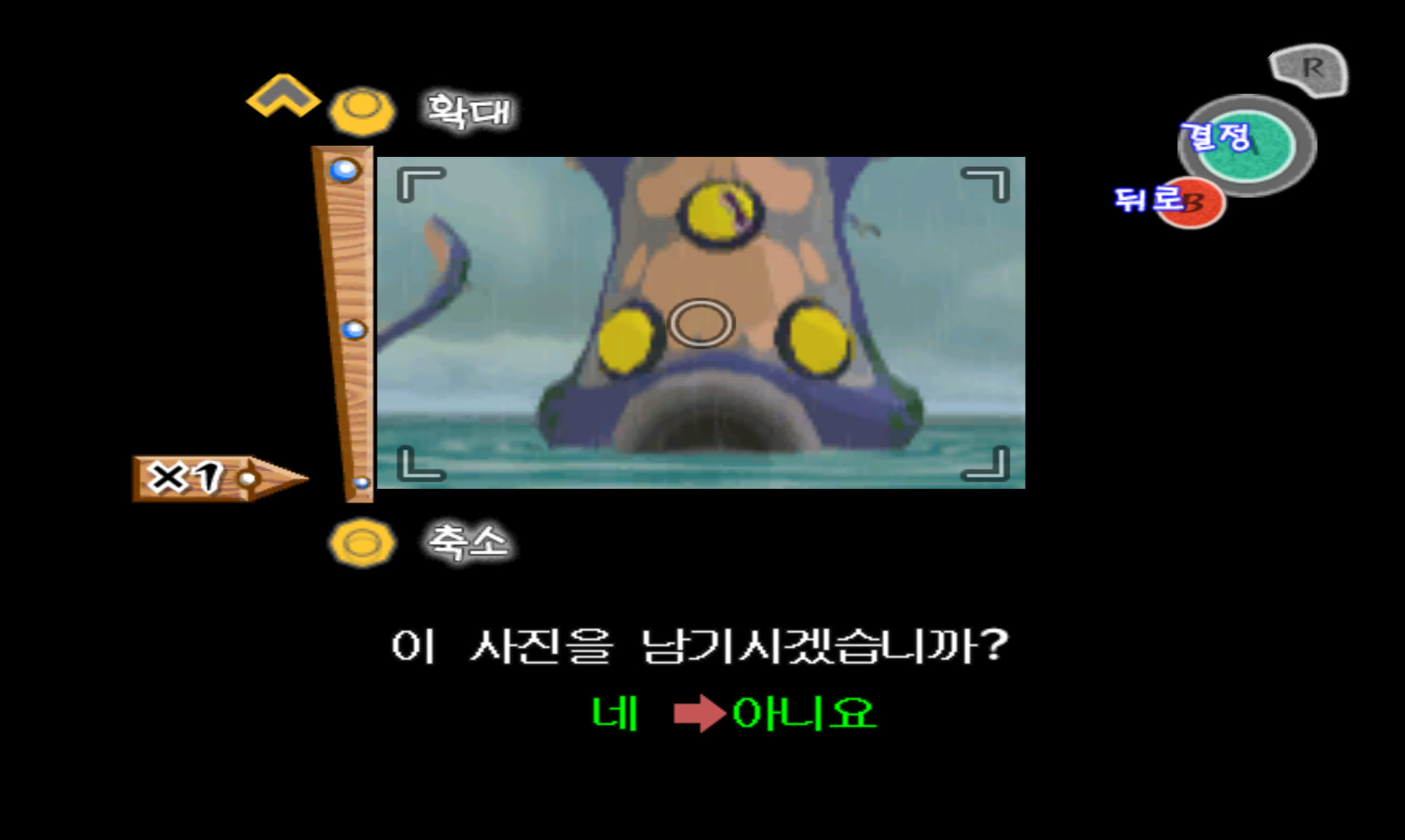 17-1. 보스전이 시작하면 바로 뒤로 돌아 아래의 구도로 사진을 찍어줍니다. 이 보스 전은 초기에 물이 차는 방에서 경사로를 따라 빠르게 위로 올라가는 구조입니다. 그렇기 때문에 사진을 찍는 기회는 바로 보스 전 시작 시 뿐입니다. 전면부와 대가리와 가슴 정도만 찍히면 됩니다.
