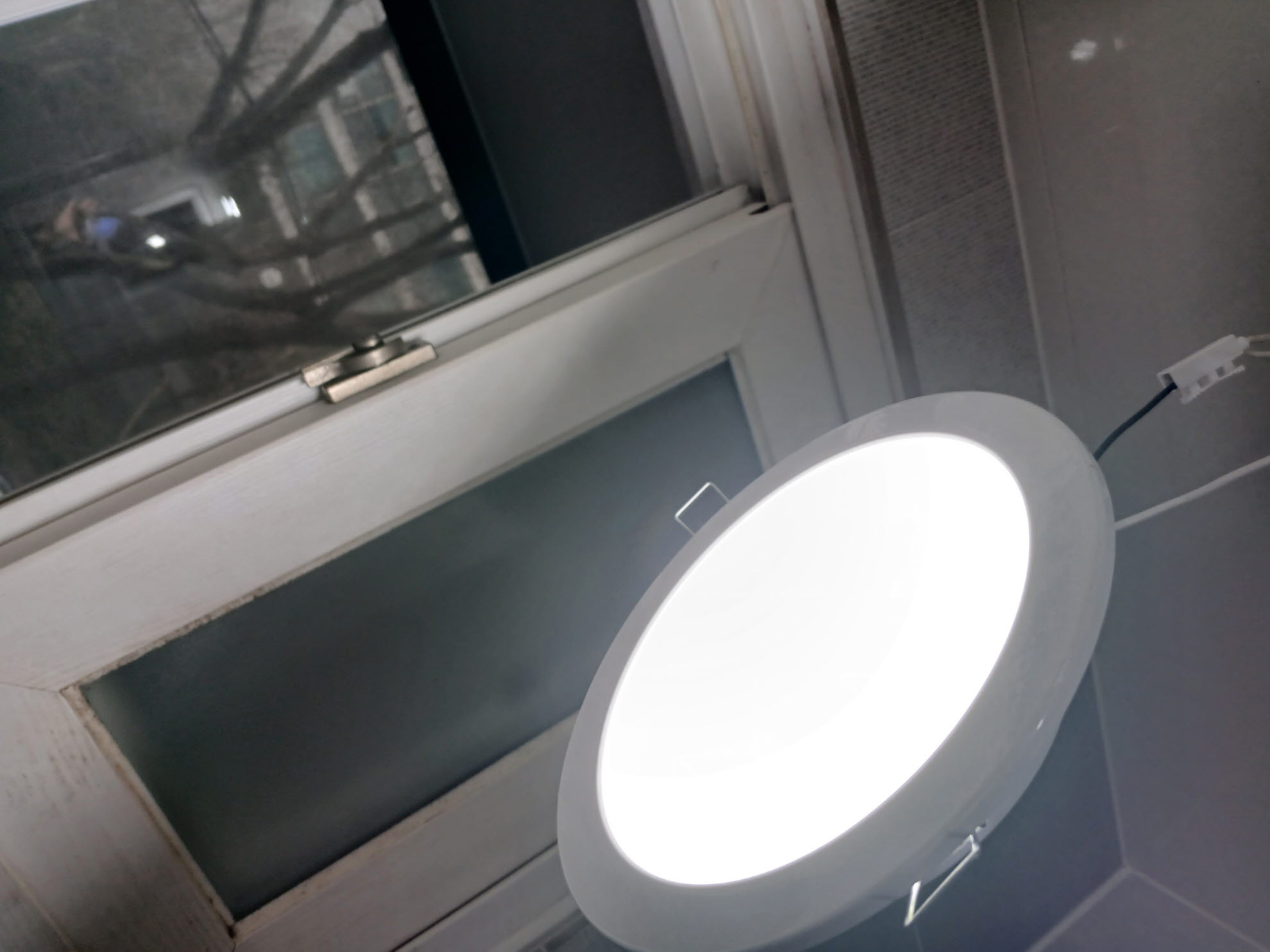 8. 새로 사 온 놈을 달아 두고 전원 스위치를 올려보았습니다. 새것의 사진도 찍었어야 하는데 작업 다 끝나고 나니 생각나더군요.... 뭐 어차피 구조는 거진 똑같은 지라... 어쨌든 설치는 탈거의 역순입니다. 아까 빼놨던 전선 2개를 새로 사 온 LED 매립등의 전원 연결 단자에 연결해 주고, 클립은 1개를 손가락으로 올려서 한쪽을 천정의 등 장착 위치에 걸쳐 준 후 반대쪽 역시 위로 올리고 걸쳐 주면 됩니다.