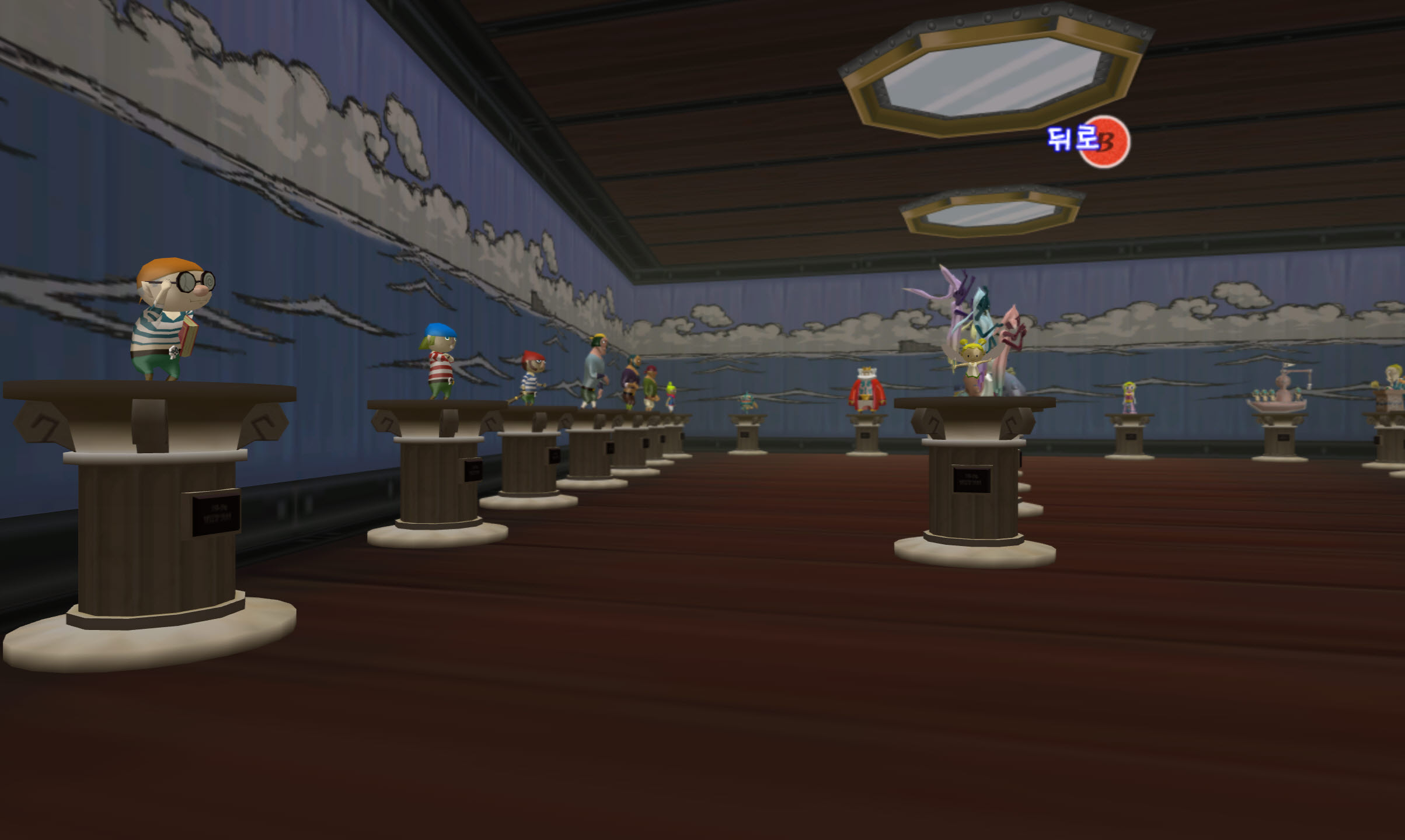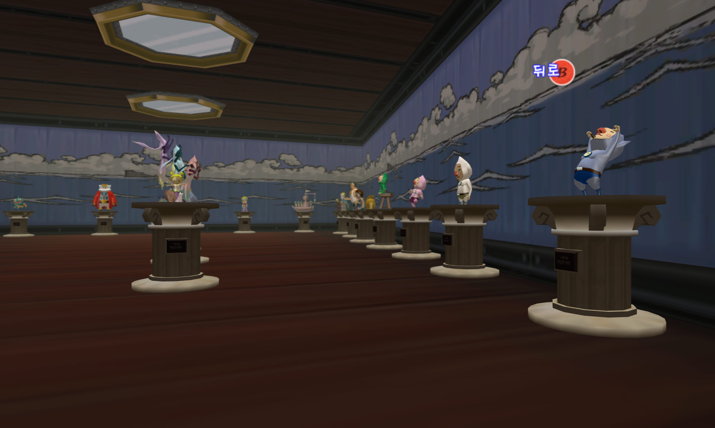2. 제작된 피규어는 닌텐당 갤러리의 주인장 정면을 기준으로 오른쪽에서 첫 번째 방에 보관됩니다. 문 주위 벽과 방안의 벽지가 대양을 표현하고 있습니다.