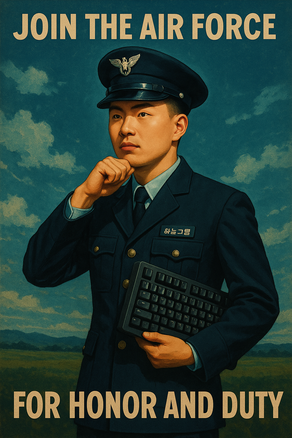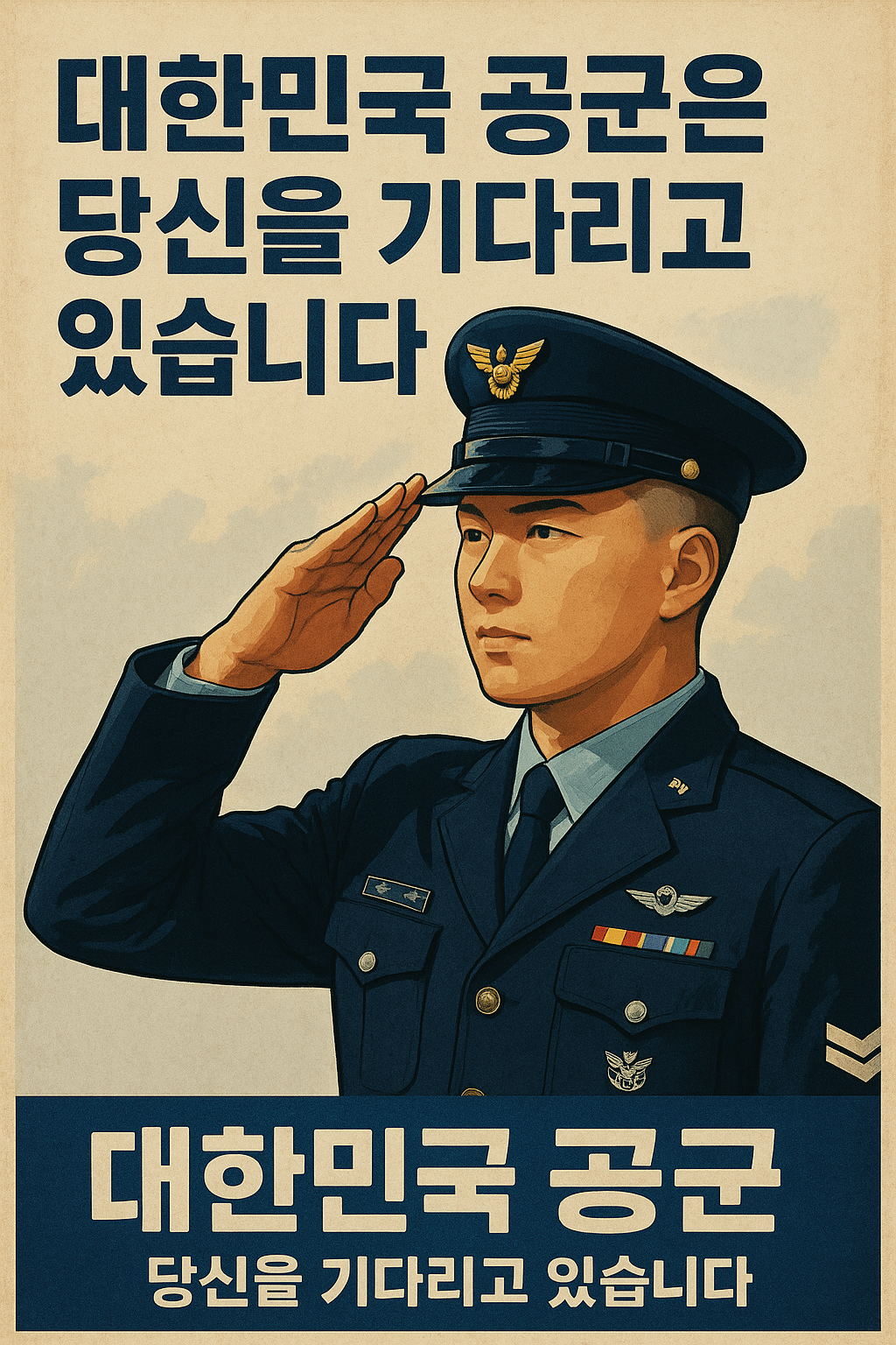 같은 사진 가지고 "대한민국 공군은 당신을 기다리고 있습니다"라는 문구를 가진 한국군 모병 포스터 스타일의 이미지를 만들어 달라고 했더니 첫 결과물은 다음 처럼 나왔네요.
