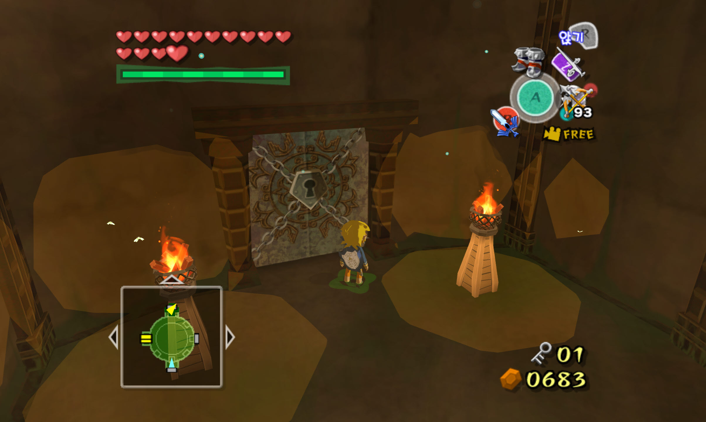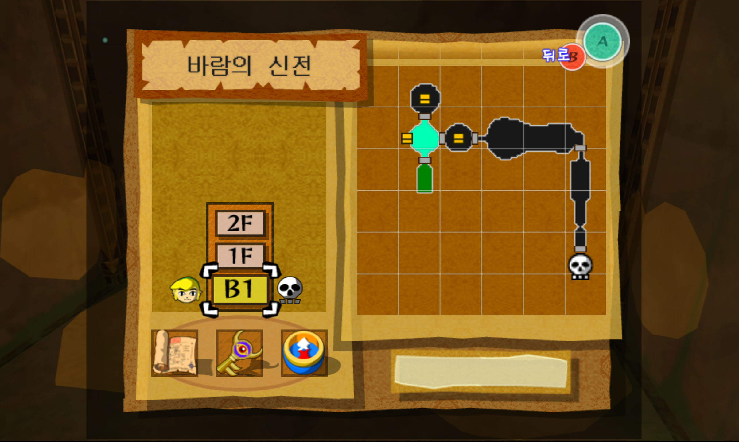 ※ 중간보스전을 마치고 게임 저장 후 타이틀 화면으로 나갔다가 다시 저장된 게임을 이어하면 바람의 신전 초입에서 시작합니다. 그래서 밖으로 나간 후 숲의 섬 닌텐당 갤러리에 가서 피규어 제작을 하고 바람의 신전을 재공략하는 걸 추천드립니다.