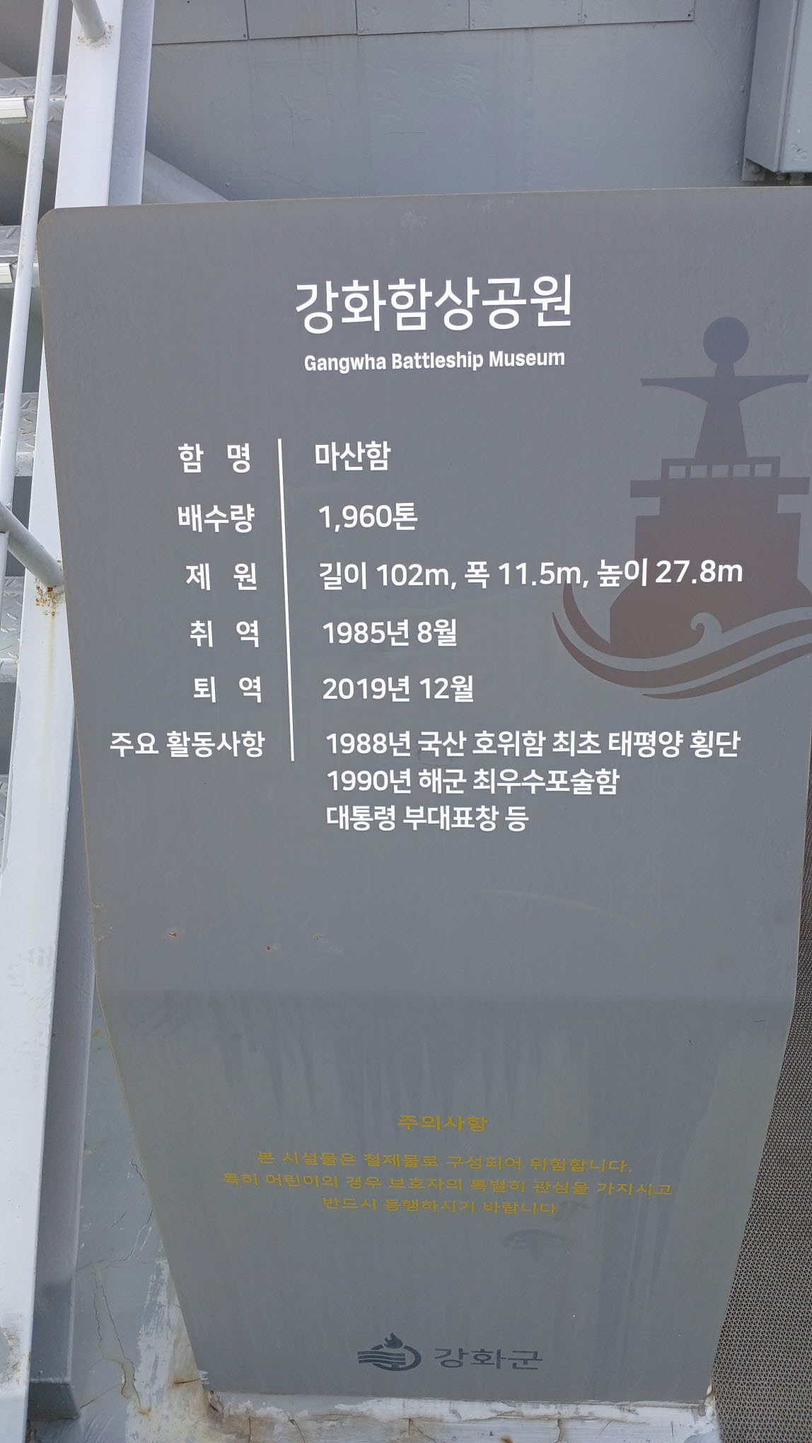 슬슬 저녁 식사를 하러 어디로 갈 것인지 정하다가 외삼촌이 외포항으로 가자고 해서 이동하던 중 해군 배 한 척을 발견했습니다. 가까이 가보니 강화 함상 공원이라고 퇴역 전함을 가져다 전시해 놨더군요. 마침 사촌 동생은 해군 수병 출신이라 반가운 듯해서 다 같이 구경 갔습니다. 그러나 정작 해군 함정 내를 돌아보던 사촌 녀석은 PTSD가 나타난다고 하더군요. ㅋㅋㅋ 자기가 타던 배랑 거의 같은 함정이라던데...