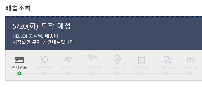 저 위 배송조회 과정이 최소한 배송시작이나 국내 도착 정도까지 진행되어 있었으면 5월 20일 넘어서 도착해도 그런가 보다 했을 겁니다만. 이건 뭐 결제만 확인되고 진행이 없으니...